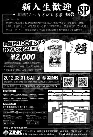 2012/3/31 「東灘PRIDE」vol.5-新入生歓迎SP- @KOBE ZINK open : 17:00 close 24:00 ADV : 1000yen FLYER : 1500yen Door : 2000yen 【女性限定】受付で「東灘PRIDE」なう。とつぶやけばFREE★ ※入場時に別途1ドリンク代必要 【新入生限定】学生証提示でもれなくドリンクチケットを1枚プレゼント★ 【SOUND】 PERCENT KING CAMEL SOUND STRIKE 【DJ】 TETSUYA ICE LATOR a.k.a T.A.C 【LIVE】 LIGHT2 BONE CHINGAN NATURAL P Direito KAZU CATHY SAYAKA 【DANCE】 Hot kRalice 【即興詩人】 つなぎ