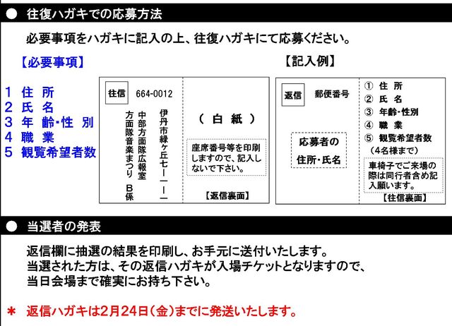 毎年恒例の季節がやってきました。 方面音楽隊をはじめ、さまざまな方面管内音楽隊や、太鼓などが出演かと思われます。 締め切りは1月17日必着です。 http://www.mod.go.jp/gsdf/mae/matsuri/pc.index.html パソコンから応募 http://www.mod.go.jp/gsdf/mae/matsuri/pc.index.p.html 携帯電話から応募(PC経由) http://www.mod.go.jp/gsdf/mae/matsuri/pc.index.k.html 往復はがきでの応募 http://www.mod.go.jp/gsdf/mae/matsuri/pc.index.h.html