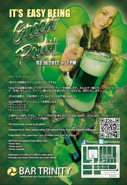 ¥°¥ê¡¼¥ó¥Ñ¡¼¥Æ¥£¡¼ ¤³¤Î»þ´ü¤Ï¥°¥ê¡¼¥ó¤Ë¤Ê¤ê¤¿¤¤¤Ç¤¹¤Í! ¿À¸Í»°µÜ¤ÎBar Trinity¤Ç¤Ï¶âÍËÆü¤ÎÌë¤Ë¥¢¥Õ¥¿¡¼¥ï¡¼¥¯¥Ñ¡¼¥Æ¥£¡¼¤ò³«ºÅ¤·¤Þ¤¹¡£¤ß¤ó¤Ê¤Ç°ì½ï¤Ë¥»¥ó¥È¡¦¥Ñ¥È¥ê¥Ã¥¯¡¦¥Ç¡¼¤ò½Ë¤¤¤Þ¤·¤ç¤¦¡£¥°¥ê¡¼¥ó (ÎÐ) ¤Î¤â¤Î¤ò¿È¤ËÉÕ¤±¤Æ¤¤¤ëÊý¤Ë¤Ï¡¢³ä°ú¤¤¤¿¤·¤Þ¤¹¡£ 3·î16Æü¶âÍËÆü¡¢¸á¸å7»þ¥ª¡¼¥×¥ó (DJ¥¤¥Ù¥ó¥È¤Ï¸á¸å10:30¤è¤ê) ÅöÆü¤ÏÆÃÊ̤ʥ°¥ê¡¼¥ó¥á¥Ë¥å¡¼¤òÄ󶡤·¤Þ¤¹¡£ *¥°¥ê¡¼¥ó¥Ó¡¼¥ë *¥°¥ê¡¼¥ó¥Ñ¥ó¥Á *¥°¥ê¡¼¥ó¥«¥¯¥Æ¥ë Æþ¾ìÎÁ¤Ï1,500±ß¡£¤¿¤À¤·¡¢¥°¥ê¡¼¥ó¤Î¤â¤Î¤ò¿È¤ËÉÕ¤±¤Æ¤¤¤ì¤Ð1,000±ß¡£(¤½¤ì¤Ë²Ã