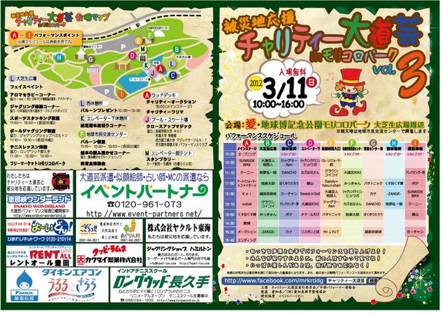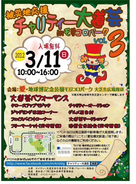 表題通りのイベントに当バルーンアートアニメ特撮部として参加させて頂く事になりました すでにつくもんちゃんから声がかかってるメンバーさんもおられますね〜 どんな形になるか詳細は未定ですが グリーティングとバルーン販売がメインになるかと思われます すべてボランティアです!収益は全てチャリティに回されますので ご理解いただける方で時間と余裕があればご参加下さいね 公式サイト http://www.facebook.com/mrkrddg マイカーで来場下さる方 朝8時に北口集合で一斉入場との事です 電車でお越しの皆さんは名古屋駅