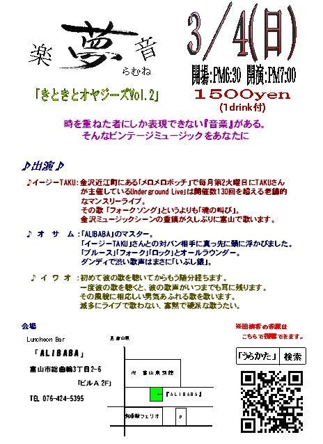 3/24(土)18時。婦中町のカフェ「nowhere」にて開催。1000円(1ドリンク付)。