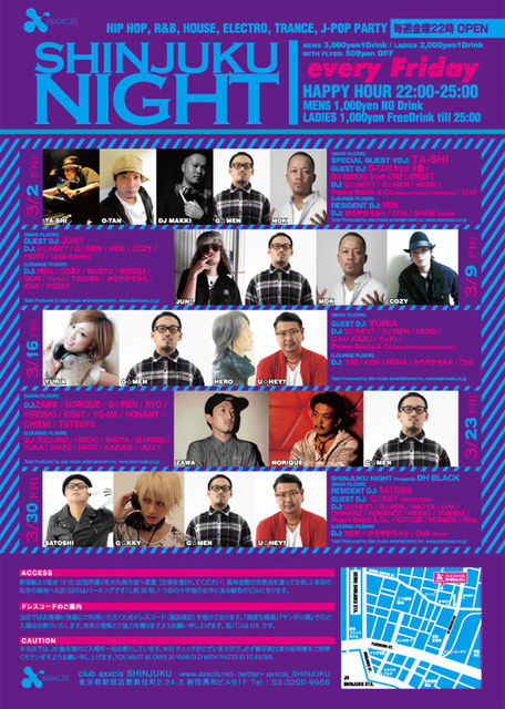 3/9(FRI) SHINJYUKU NIGHT “SWAG” OPEN 22:00 CLOSE 05:00 ☆HAPPY HOUR(22:00〜25:00)☆ MENS:1,000円/NO DRINK LADIES:1,0000円/FREE DRINK (25:00まで) 25:00〜 MENS:1,500円/NO DRINK LADIES:1,0000円/1DRINK 通常3000円かかってしまうところ、 ★★★★★★★★★★★★★★★★★★★★★ axxcisエントランスにて、 『ボンズのゲストでボンズ』 ★★★★★★★★★★★★★★★★★★★★★ とお伝えするとゲストで何人でも入場できますので是非お使いください!!!! 個