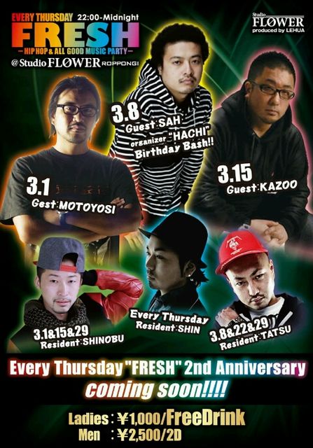 管理人様書き込み失礼します。 3月15日(木)は六本木Flowerにて『FRESH』!! ---------■□■□■□■□■□■□■□■--------- ★ゲストでの入場方法はコチラ★ エントランスにて 『シノブのゲストでフレッシュ』 と、伝えて頂ければ [ゲスト料金] 男性2000円 2Drink+2Shots 女性1000円 飲み放題+Mix CD or シャンパンチケット にてご入場頂けます。 ---------■□■□■□■□■□■□■□■ --------- 六本木 Studio FLOWERにて、HipHop Party『FRESH』が開催されます!! 毎回500人規模で盛り上がりを見せる、今や都内