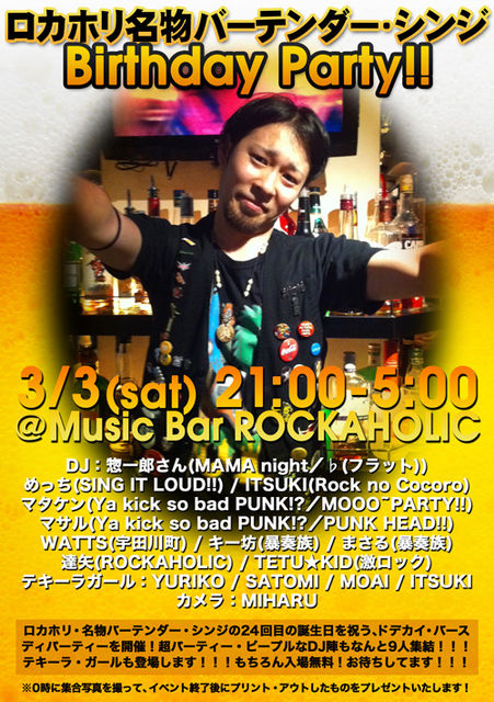 ロカホリ・名物バーテンダー・シンジ バースディ・パーティー!!! 3/3(土)21:00〜5:00 @Music Bar ROCKAHOLIC DJ: 惣一郎さん(MAMA night/♭(フラット)) めっち(SING IT LOUD!!) ITSUKI(Rock no Cocoro) マタケン(Ya kick so bad PUNK!?/MOOO~PARTY!!) マサル(Ya kick so bad PUNK!?/PUNK HEAD!!) キー坊(暴奏族) まさる(暴奏族) WATTS(宇田川) 達矢(ROCKAHOLIC) TETU★KID(激ロック) テキーラガール: YURIKO SATOMI MOAI ITSUKI ロカホリ・名物バーテンダー・シンジの24回目の誕生日を祝う