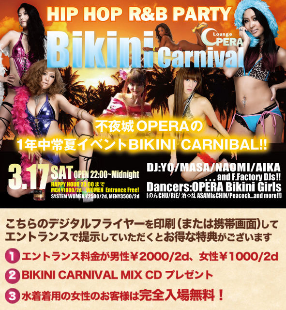 管理人様、告知失礼致します。 【イベント情報】 ■2012.3.17(Sat)「BIKINI CARNIVAL」 23:00〜 DJ : TAKASHI/ACE/YO/NAOMI/MASA/AIKA 毎月第三土曜日は不夜城Lounge OPERAの鉄板イベント ”BIKINI CARNIVAL”!! 春の訪れと共に、更にパワーアップした BIKINI CARNIVALで朝までカーニバル!! ☆☆☆☆☆☆☆☆☆☆☆☆☆☆☆ mixi特典と致しまして、エントランスにて『mixi見た!』といって頂ければ 大変お得な、下記ゲスト料金にて入場頂けます。 ご不明な点がございましたら、お気軽にメッセ下さい。 ↓↓