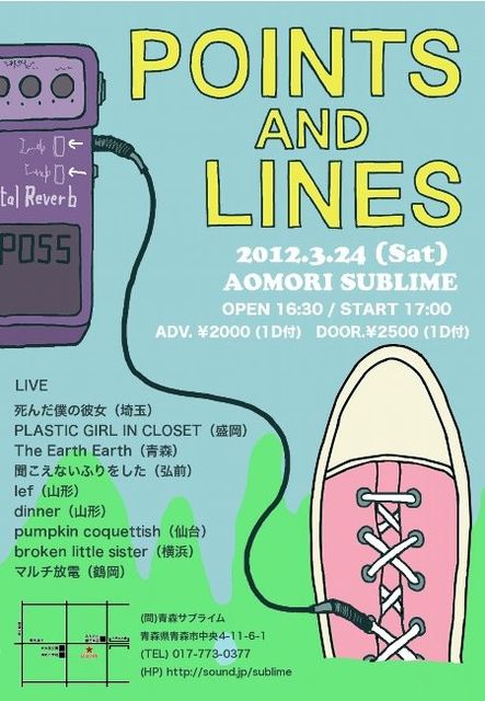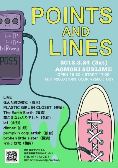 『points and lines』 3/24(土)@青森サブライム op/st 16:30/17:00 adv/door \2,000/\2,500(1dri込み) 死んだ僕の彼女(埼玉) PLASTIC GIRL IN CLOSET(盛岡) The Earth Earth(青森) 聞こえないふりをした(弘前) lef(山形) dinner(山形) pumpkin coquettish(仙台) broken little sister(横浜) マルチ放電(山形)