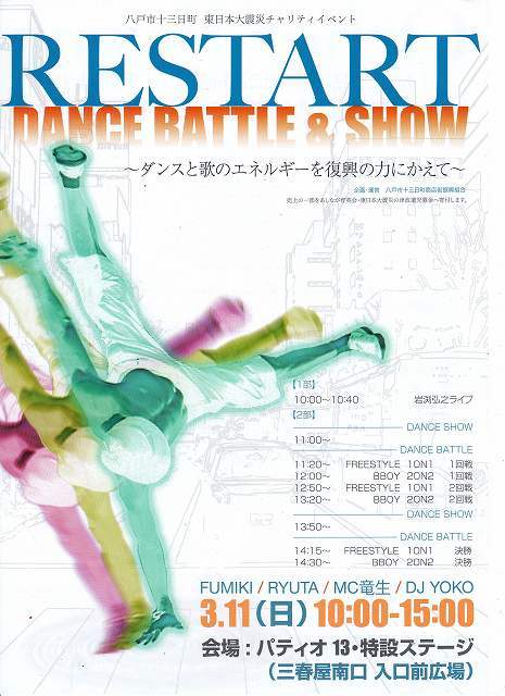 RESTART DANGE BATTLE&SHOW 東日本大震災チャリティイベント 日時 2012・3・11 場所 八戸市十三日町三春屋南口ひろば パティオ13・特設ステージ 予定時間 10:00〜15:00 【1部】 10:00〜10:40 岩渕弘之ライブ 【2部】 11:00〜 DANCE SHOW DANCE BATTLE 11:20〜 FREESTYLE 10N1 1回戦 12:00〜 BBOY 20N2 1回戦 12:50〜 FREESTYLE 10N1 2回戦 13:20〜 BBOY 20N2 2回戦