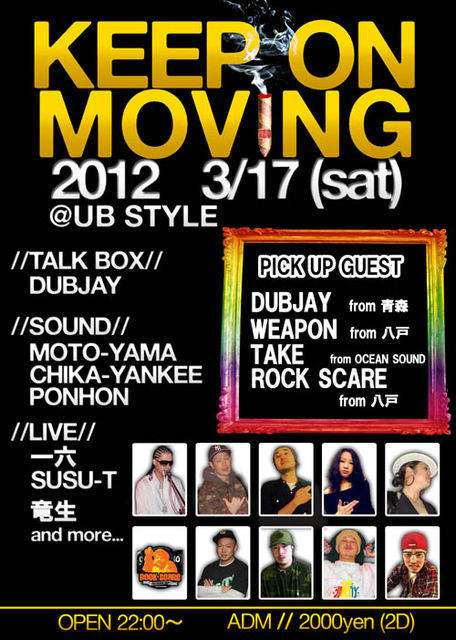 REGGAE HIPHOP イベント! >3/17(SAT ) keep on moving ! @UB STYLE > OPEN 22:00〜 ADM \2000 2ドリンク付き >Pick up guest DUBJAY【青森】 TAKE F ROM OCEAN SOUND 【八戸】 > >SOUND > >MOTO-YAMA SOUND >CHIKA YANKEE >PONHON >ROCK SCARE 【八戸】 >WEAPON 【八戸】 > LIVE SHOW > >DUB JAY (TALK BOX) >SUSU-T >ICHIROKU >竜生 >…and more > > > >3月17日 keep on moving ! >弘前唯一のREGGAE のダンス!! 毎月第3土曜日開催中! 今月はLIVEがあります◎ PICK UP GESTとしてDUB JAY