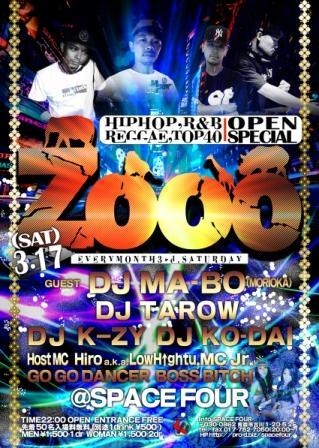 告知失礼いたします。 青森市第3土曜日の HIPHOP PARTYの決定版「Zooo」!! 1月・2月とPreOpenにもかかわらず、非常に多くのお客さんに遊びに来て頂き本当にありがとうございました! 今月から満を持して、 青森市第3土曜日 HIPHOP PARTYの決定版「Zooo」が本格OPENします! 「Zooo」OPEN一発目! OPEN SPECIALを飾ってくれるゲストは盛岡から!!! DJ MA-BO 言わずと知れた、盛岡の最重要人物。 青森市で彼のプレイを聞けるまたとないチャンスです。 盛岡のシーンを最前線で引っ張っている「DJ MA-B