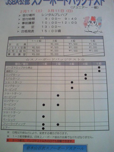 3月11日に今期最終の、JSBA公認のバッチテストを行いますo(^^)o みなさまの挑戦お待ちしております☆ なお、3〜5級に関しましては、レッスン時に級別のレベルに達してましたら認定できる、レッスンチェック方式も随時受付しておりますのでふるってご参加くださいませ☆ スノーボードスクール・検定に関するお問い合わせは スクール携帯電話09043166573唐牛 もしくはこちらに書き込みいただくか、当方にメッセ送信何とぞよろしくお願いいたします。 スクールHP(バッチテストページ)http://www.hyakusawa-board.com/?page_id=9