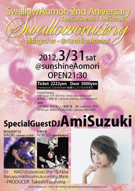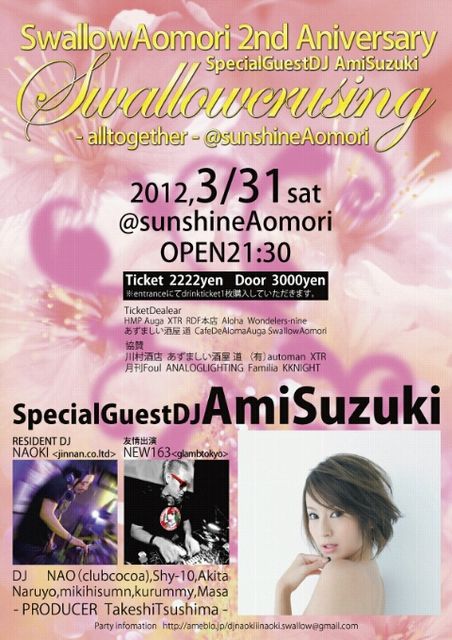 2012.03.31 SwallowAomori2ndaniversary Swallowcrusing-Alltogether-@SunshineAomori 21:30start!! GuestDJ AmiSuzuki-鈴木亜美 RESIDENTDJ NAOKI(jinnan.co.ltd) 友情出演 NEW163(glambtokyo) DJs NAO(clubcocoa),Akita,shy-10,naruyo,mikihisumn,kurummy ticket 2222yen Door 3000yen ※entranceにて別途1Drink購入して頂きます ticketdealer HMP Auga RDF 本店 XTR Aloha wondelars-nine CafedeAloma Auga あずましい酒屋道 SwallowAomori 協賛 川村酒店 あずましい酒屋道 XTR 月刊Foul (有)automa