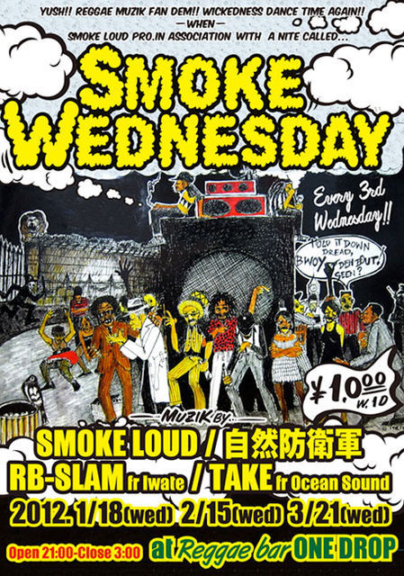 管理人様、告知失礼します。 SMOKE LOUD PRESENTS 「Smoke Wednesday 」 3/21(Wed)HACHINOHE@reggae bar onedrop open start 21:00〜3:00 1000yen/1drink <SOUND> SMOKE LOUD RB-SLAM from IWATE 自然防衛軍 TAKE from OCEAN SOUND SKY HOOK from MISAWA ============================= NEXT... (4/18 wed Smoke Weneday guest sound BASS TRIBE!!!) =============================