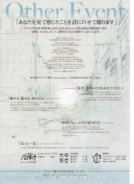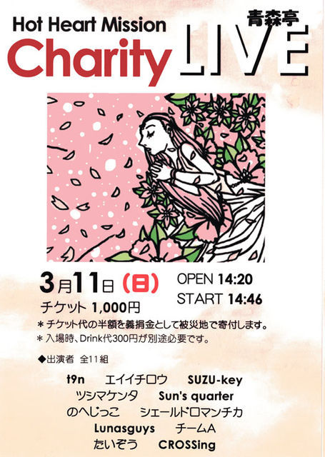 Hot Heart Mission チャリティー LIVE PLACE 青森市 郷土芸能館 青森亭 OPEN 14:20 START 14:46 PAY \1000 (内半分は東日本大震災義援金になります) ※ 当日ドリンク代¥300別途必要です ACT t9n エイイチロウ SUZU-key ツシマケンタ Sun's quarteter のへじっこ シュールドロマンチカ Lunasguys チームA たいぞう CROSSING