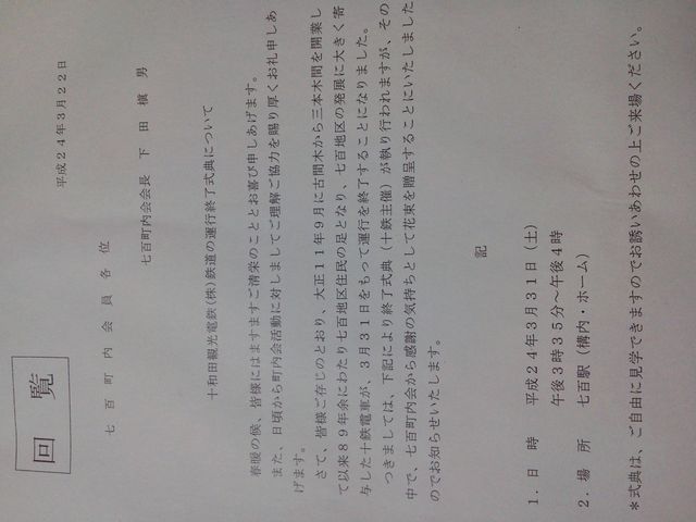 いよいよ廃線も確定したとうてつ電車。 ささやかながら、地元町内会からもお別れのあいさつを、ということで、ご案内いたします。 (画像をご参照ください)