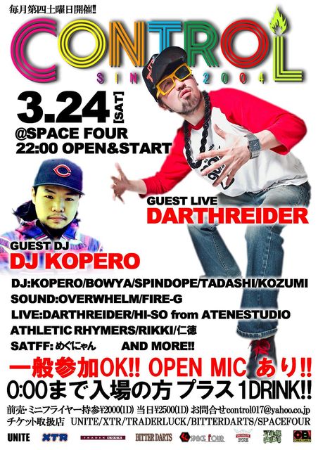 2012年 8年目に突入[毎月第四土曜開催コントロール] 今月は、日本語ラップ界から超ビッグゲスト!!!!!!!! なんと!Da.Me.Records!!【DARTHREIDER】が登場!更に、acharuそしてDARTHREIDERのバックDJを務める【DJ KOPERO】のプレイも!もちろん今月も自由参加OKのOPEN MICは健在!0:00までの入場で、プラス1ドリンクの特典付き! 青森でこの二人のショーケースを体感できるのはこの夜だけ! ■CONTROL!!!!!!!!!! 2012/3/24(Sat) @青森SPACE FOUR http://prod.p1.bindsite.jp/spacefour/index.html 22:00 OPEN&START!!!! 0:00ま