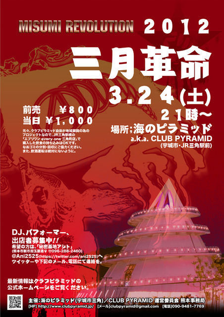 MISUMI Revolution 2012三月革命 3.24(土)21時〜 場所;海のピラミッドa.k.a. CLUB PYRAMID(宇城市・JR三角駅前) DJ、パフォーマー、出店者募集中! 希望の方は、 「秘密基地アジト」(熊本市新市街玉屋通り 096-288-2460) aniさん http://mixi.jp/show_friend.pl?id=530685 へメッセージまたは 電話090-9481-7769にて連絡を。 前売800/当日1,000 元々、クラブピラミッド自体が地域振興の為のプロジェクトなので、 JR三角駅横の「エブリワン every