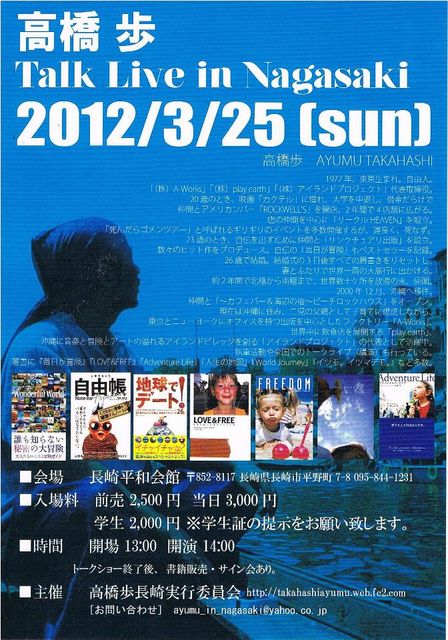 管理人さま、貴重なスペースに告知失礼します。 「愛する人と、自由な人生を」を掲げて生きる自由人、高橋歩が遂に長崎上陸!!飲食店や学校の経営・出版社の立ち上げ・妻との世界一周etc…夢を次々に形にしてきたこれまでの人生や、自分なりの成功論を語ります♪ ワクワクした人生を送りたい☆自分を成長させたい☆夢に向かう後押しが欲しい☆1つでも当てはまる人は是非、お越しください!! 高橋歩講演会in長崎 2012年3月25日(日) 13:00 開場 14:00 高橋歩トークライブ 15:30 書籍販売&サイン会 会場:長崎市平和会館(長崎市平野