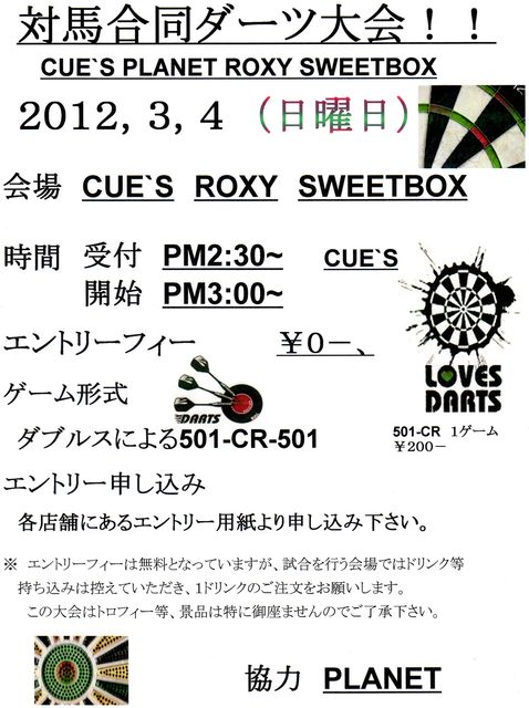 3/4(日曜日) 対馬合同ダーツ大会を開催します(^-^)/ 今回は初心者の方も気軽に参加出来るダブルス大会です。 皆さんよろしくお願いします