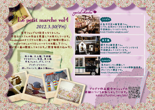 少しずつ、春が近づいてきてますね〜♪ 桜の季節が待ち遠しいHalusolaです^^ さて、春の手しごとCafe market 開催決定です!! 日時 :2012年3月19日(月)14:00〜16:00 場所:Nana Cafe(長崎市城山町2-9) 参加費 :1500円 ※材料費・ケーキセット(600円)代込 内容:ビーズや天然石を使ったアクセサリーを作ります。 ピアス、イヤリング、ヘアゴム、リングの中から、お好きなものをお選びいただけます。 定員:8名(予約制) ☆駐車場はありません。近隣駐車場をご利用くださ