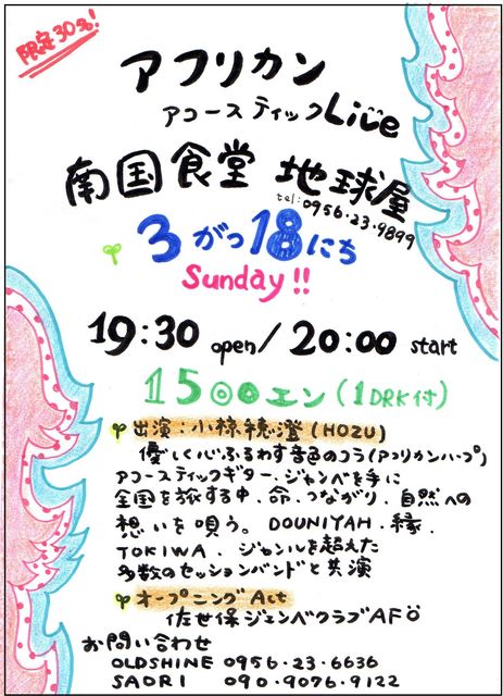 地球の屋根裏のドス黒い楽園 -生 宴- 日時:3月7日(水)午後8時00分開場 於:佐世保市下京町9−20 南国食堂地球屋 出演:三上寛/ハナクソ(高知)/Howling Setta チケット:前売¥2500/当日¥3000 *1ドリンクチケット付 お問い合わせ先 地球屋 0956−23−9899 ◆Howling Setta参加予定メンバー Vo. & A-Gt. ハウリン伊達丸/E-Gt. the bento(the bento band)/Key Harp terra(AFO 松本浩太バンド....etc)/Jyembe Ha~sann(AFO)/Cajon MOMOchann(オトヒトツ) ◆セット