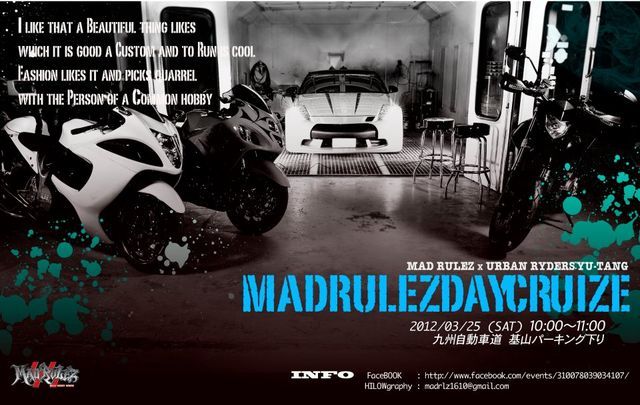 みなさんイベントのお知らせです イベント元は↓ 『HOODRIDAZ』 http://mixi.jp/view_community.pl?id=5026274 ↓↓↓以下イベントのコピー文です。 皆さん・・・新年明けてもう間もなく1ヶ月がたとうとしとりますが、目標に向けて頑張っておりますか・・・HILOWは・・・アイカワラズです さぁ本題↓ 今回のイベント『MADRULEZ DAY CRUIZE!!!』は・・・ メインイベント『HOODRIDAZ』が車メインのイケイケGOGO重視としたらこちらは、いつもとは違うマッタリ&コミュニケーション・バイク重視のイベントの方向
