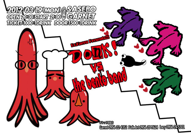 03.19.Mon Dr.Kaeru Presents!!! DONK! vs the bentoband @佐世保ガァネット OPEN 20:30/START 21:00 TICKET/\1000+1DRINK (DOOR/\1500+1DRINK) ステージにDONK!.フロアにthe bentobandがセットを組み.1曲ずつ交互に演奏するまさに対決ライブです!!! どうなる!どうなる! みなさん是非お越し下さい!!