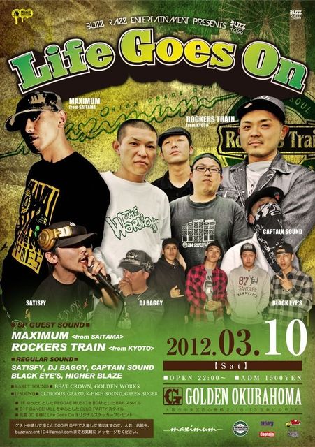 告知失礼します。 2012. 3.10 [sat.] BUZZ RAZZ ENTERTAINMENT presents 『 Life Goes On 』 @GOLDEN OKURAHOMA 大阪市中央区西心斎橋2-16-13宝泉ビルB1F ■ ADM 1500yen ■ OPEN 22:00 〜     【 GUEST SOUND 】 ・MAXIMUM from SAITAMA http://mixi.jp/view_community.pl?id=53960 ・ROCKERS TRAIN from KYOTO http://mixi.jp/view_community.pl?id=224307 【 REGULAR SOUND 】 ・SATISFY ・DJ BAGGY ・CAPTAIN SOUND ・BLACK EYE’S ・HIGHER BLAZE 【 EARLY SOUND 】 ・