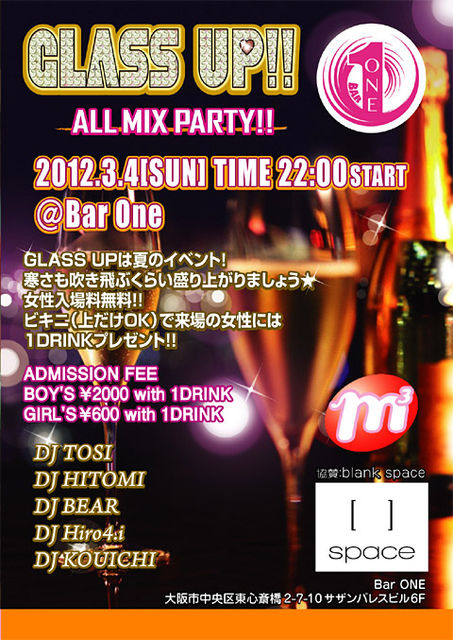 ハート【GLASS UP!!】ハート -ALL MIX PARTY♪- 2012.3.4(Sun)22:00〜 @Bar ONE[旧SAM&DAVE-ONE] ハート女性は入場料無料(1drink代必要) しかも… ビキニ(上だけでもOK)で来場の女性には1drinkプレゼント アンモナGlass upはこんな感じで盛り上がってました http://photo.mixi.jp/view_album.pl?album_id=422201185535174&owner_id=10336943 ■2012/3/4(日)GLASS UP!!@Bar ONE■ ヘッドフォン毎年夏、須磨海岸にて400人オーバーで盛り上がっているALL MIX PARTY『GLASS UP!!』が今回、大阪ミナミのオシャレな