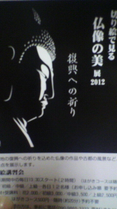 西村幸祐 切り絵で見る仏像の美展2012@飛鳥園 復興への祈り 被災地の復興への祈りを込めた仏像や古都の風景など25点を展示 http://www.create-net.co.jp/kirie.html#1003(詳細) 開催日時:2012年3月13日(火)〜18日(日)10:00〜17:00 入場無料 開催場所:仏像写真ギャラリー飛鳥園 http://www.askaengallery.jp/ 地図http://www.askaengallery.jp/access/index.html 〒630-8213 奈良市登大路町59 TEL FAX:0742-22-5883 営業時間:AM10:00〜PM6:00 (11月〜3月はPM5:00まで) 定休日:毎月曜日(祝日は営業)