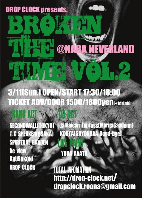 3/11@奈良NEVER LAND DROP CLOCK pre. 『BROKEN THE TIME vol.2』 17:30/18:00 w. SECONDWALL(東京) T.C SPEAKER(大阪) SPIRITUAL GARDEN Re view アルソコニ -DJ- Jamaican Express(MoritaGaadenn) KOUTA(さよならgood-bye) -LIVE PAINT- 弓場新太 SECONDWALL T.C SPEAKER
