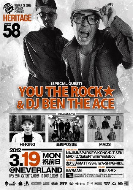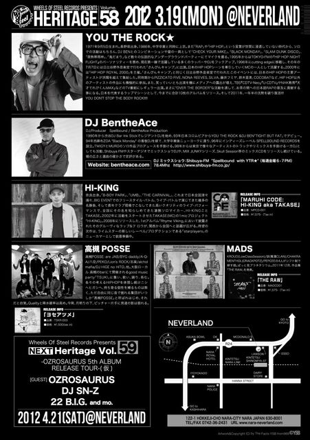 管理人様、告知の方失礼致します。 『Heritage Vol.58』 2012 3.19(MON / 祝前)@NEVERLAND START 22:00 ADV. TICKET 2,500YEN+1D DOOR. 3,000+1D [SPECIAL GUEST] YOU THE ROCK★ & DJ BEN THE ACE http://bentheace.com/ Shibuya-FM "Spellbound with YTR★" (毎週金曜6-7PM) 78.4Mhz http://www.shibuya-fm.co.jp/ [RELEASE LIVE] HI-KING http://team-hk.seesaa.net/ http://www.myspace.com/narahiking 高槻POSSE http://ameblo.jp/tsuki-recordings/ MADS http://soundcloud.com/sh-beats http://crack