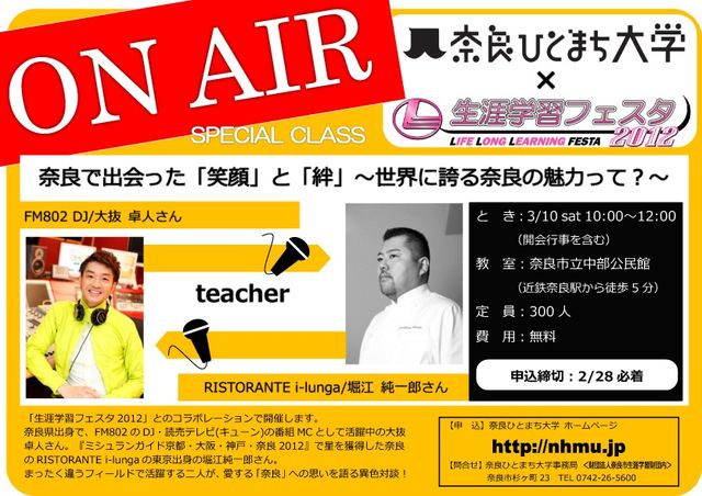 管理人様、告知失礼いたします。 はじめまして 奈良ひとまち大学です 奈良ひとまち大学とは、奈良市全体をキャンパスに見立て 奈良市で暮らし、働く方を先生に迎え、 奈良の新しい魅力に触れる学びの場をつくる市民大学です。 ※奈良ひとまち大学は、学校教育法上で定められた正規の大学ではありません。 生涯学習を推進する団体です。 今回は、奈良県出身である大抜卓人さんを先生にお招きして、【特別授業】を行います コミュニティメンバーのみなさまのお申込みをお待ちしています 生涯学習フ