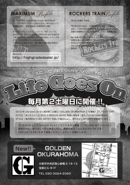 告知失礼します。 2012. 3.10 [sat.] BUZZ RAZZ ENTERTAINMENT presents 『 Life Goes On 』 @GOLDEN OKURAHOMA 大阪市中央区西心斎橋2-16-13宝泉ビルB1F ■ ADM 1500yen ■ OPEN 22:00 〜 【 GUEST SOUND 】 ・MAXIMUM from SAITAMA http://mixi.jp/view_community.pl?id=53960 ・ROCKERS TRAIN from KYOTO http://mixi.jp/view_community.pl?id=224307 【 REGULAR SOUND 】 ・SATISFY ・DJ BAGGY ・CAPTAIN SOUND ・BLACK EYE’S ・HIGHER BLAZE 【 EARLY SOUND 】 ・