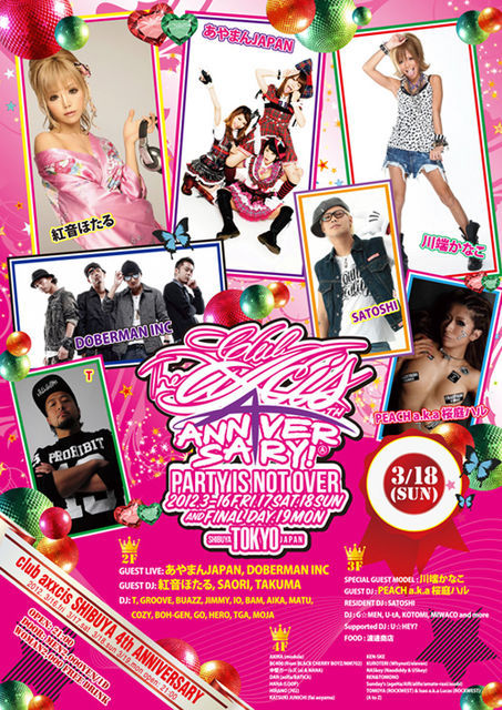 axxcis Annversary Party Not Over 3/18(日曜日)祝前日@渋谷axxcis ついに、 axxcisにあやまんJAPANが登場 この日は、 超豪華出演者 LIVE あやまんJAPAN、DOBERMAN INC ゲストDJ 紅音ほたる、PEACH(桜庭ハル)、川端かなこ(eggモデル) などなど豪華出演者 しかも、 女性は21時〜(Open)7時までの10時間、 特別ゲスト料金で1000円で飲み放題w 動員数は、 1000人以上とまさにお祭り状態のBig Party