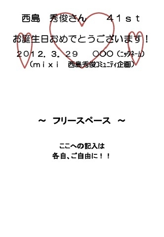 2012年3月29日時点 西島さんの41歳のお誕生日になりました。 皆さんが送ったカードが、無事に西島さんに届きますように! ご参加下さった皆様、ありがとうございました。 昨年、震災により途中から企画変更になったバースデー企画。 まだまだ落ち着かない日本ですがリベンジしませんか? 企画自体は昨年の当初のものを参考にさせて頂きました。 (昨年の企画者様のイベント参照。誕生日に贈るはずが震災で各自判断等になりました。) カード作成決定事項 たくさん送っても読んで頂きやすいように形式は同
