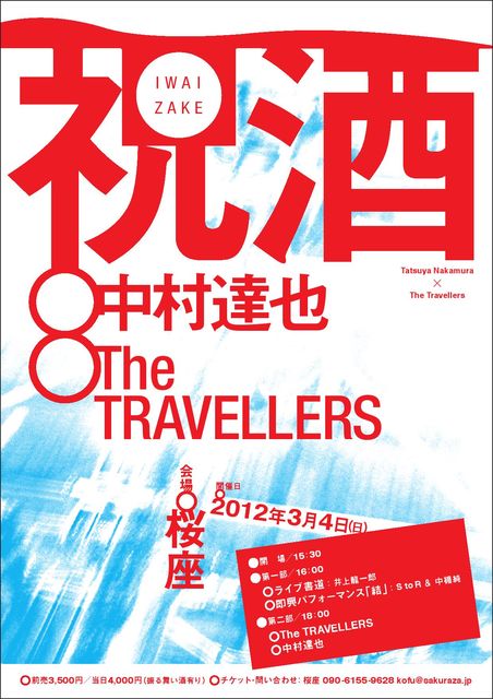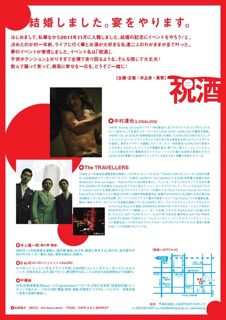 管理人様、告知失礼致します。 私事ながら2011年11月に入籍しました。 結婚の記念にイベントをやろう!と、決めたのが約一年前。 ライブに行く事とお酒が大好きな私達二人のわがままが全て叶った、イベントが実現しました。 イベント名は「祝酒」。 子供がテンション上がりすぎて全裸で走り回るような、そんな感じで大丈夫! 飲んで踊って笑って、最高に幸せな一日を、どうぞご一緒に! イベントのメインとなる第二部では 甲府に再び中村達也が! さらに福岡からはトラベラーズが! 中村達也とトラベラーズの2マン。 セッション