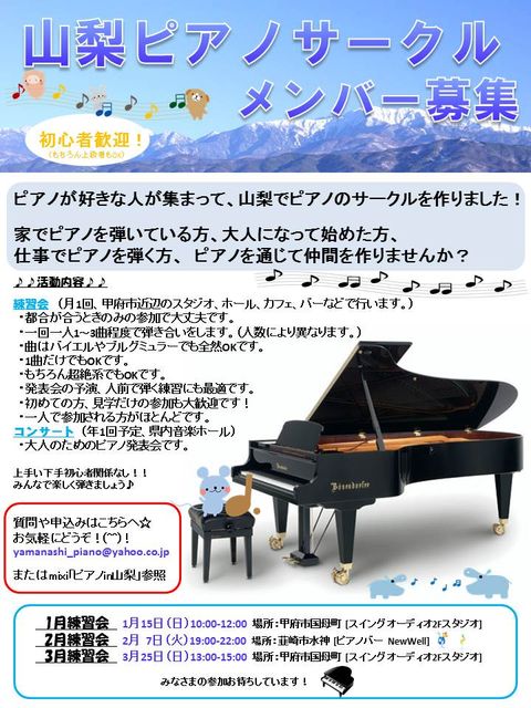 第5回ピアノ練習会 日時 2012.3.25(日)13:00〜15:00 場所 スイングオーディオ 2Fスタジオ 山梨県甲府市国母8-31-2(グランドピアノ:YAMAHA G5) 費用 一人あたり数百円〜最大で1000円(人数により異なります。) 参加はピアノが好きな方、マナーが守れる方であればどなたでも歓迎です。 ・一人1-3曲程度で弾き合いをします。 ・曲はPOPS、クラシック、ジャズ、練習曲、どんな曲でも結構です。 ・もちろん1曲だけでもOKです。 ・初めての方、見学だ