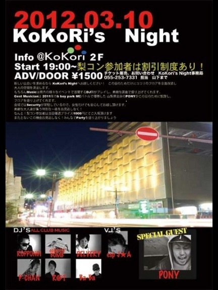 管理人様、貴重なスペースお借りしまして告知失礼いたします。 新しい出会いを求めるなら KoKori’s Nightへお越しください! この日のためだけにココリ2Fのフロアを全面改装し大人の空間を演出します。 もちろんMusicは県内の様々なイベントで活躍するDJ陣がプレイし、素敵な選曲で盛り上げてくれます。 Guest LIVEは 2011年のb boy park MCバトルで優勝した 山梨県出身のPONYがこの日のために凱旋し、フロアを盛り上げてくれます。 会場ではSecurityが常駐しているので、女性だけでも安心してお越し頂けます。 素敵な大人達が集う