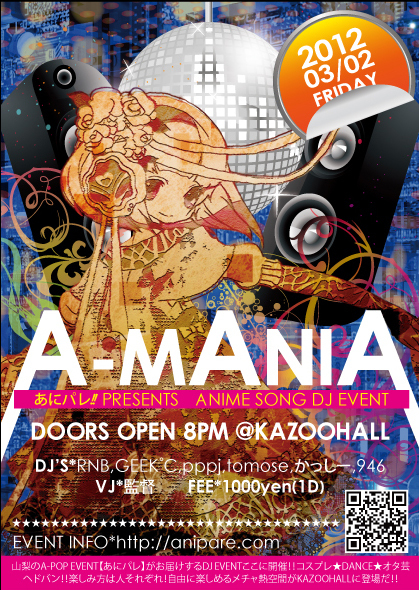 ------------------------------------------- 山梨にドドンっ!と初登場!! アニソン系DJイベント『A−MANIA』 アニソン、ボカロetc... A−POPを中心とした定番な曲からオッサレーなアレンジ曲 四つ打ち系やちょっとコアな曲まで!! “幅広いジャンル”をコンセプトにメチャ熱・胸熱空間をお届け! ちょっと変わったジャンル曲も…!? マニアックに挑戦するセットリストに期待してね☆ 音に合せてステップ踏んだり!踊ったり! 滾ったらオタ芸打ったり!叫んだり! 好きなキャラのコスプレしたり!