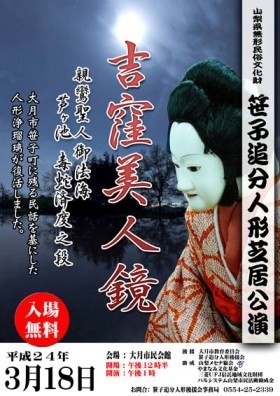 大月市笹子町に残る民話を基にした人形浄瑠璃です。 僅かな資料をたよりにやっと完成しました。 演 目:吉窪美人鏡 親鸞聖人御法海 芦が池毒蛇済度之段 人 形:笹子追分人形 西川一座 大 夫:竹本綾之助 三味線:竹本土佐子 開催日:平成24年3月18日(日曜日) 開 場:13時 開 演:13時30分 会 場:大月市民会館 大月市御太刀2−11−22 大月駅で降りましたら左に進んでください。 同時上演 傾城阿波鳴門 巡礼歌の段