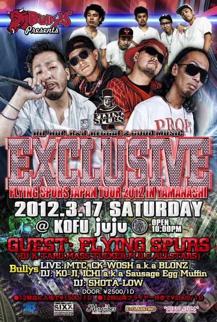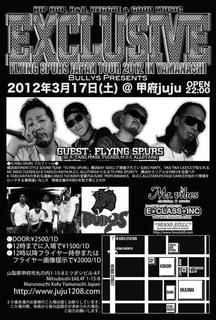 管理人様 貴重なスペースお借りして告知失礼します。 3月!!今月も!!!!甲府の夜を熱くする”楽しい”!!!PARTYのお知らせです!!!! 今回のEXCLUSIVEは 横浜のBIG PARTY!!TIKA TIKAなど横浜を中心に都内、埼玉など全国のPARTYをLOCKし続ける!! 今!!要注目!!FLYING SPURS!!のJAPAN TOUR!! 2011/11のEXCLUSIVEでもKOFUの夜を大いに盛り上げPARTYをガッツリ!!LOCKしていた!!MCの【MASS TUCKER】♪♪ さらにFLOOR DANCERとして知名度も高い【M.O.C ALLSTARS】!! そして!!! 人気MIX CD「BRING BRING」シリーズ(ドンキホーテなどで