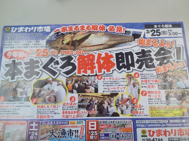 いよいよ春到来! ひまわり市場、本年最初の本マグロの解体をやります。 とびっきりの本マグロを用意します。試食もたくさん用意します。 全員強制参加(もちろん無料)のジャンケン大会もやります。優勝者には豪華景品が! 頭、カマ、中落ちのオークションも、もちろんやります。 みなさまのお越しを、ぜひぜひお待ちしております!!!