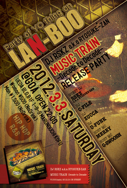 ここ最近暖かい日が続いてますねー!! 春か...って思わせる気候で色んな意味で モチベーション上げていかないとって変に感じさせてくれる季節 でもあるよーな気がします いよいよ来週に迫って来ましたねー!!! パーティー好き、そしてLAN-BOOに遊びに来てる皆様もご存知であるDDDJ!!RSKZ!! RSKZ君が先日にリリースしたNEW MIX CD『MUSIC TRAIN-DECADE TO DECADE-』 3/3(sat)はLAN-BOO×DJ RSKZ MIX CD RELEASE PARTY!!!! EVERY 1ST SATURDAY NIGHT!!! 2012/3/3(sat)☆LAN-BOO☆DJ RSKZ『MUSIC TRAIN-DECADE TO DECADE-』