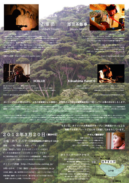 最近発行された「d desigh travel」にも掲載された ... アートも音楽も受け入れる 今からの山梨文化を発信する宿 「ホトリニテ」の場所をお借りして、 石原岳さんの素晴らしいアンビエントからノイズな演奏。 原田茶飯事さんのソフトロックやMPBの洒落っ気・茶目っ気を感じる歌。 ニューアルバムは、なんと山梨の宝 WATER WATER CAMEL田辺玄くんがホールレコーディング。 ケイドロックの、のぶちゃんユニット「NObLUE」 ターンテーブルの魔術師、fumit-Oくんのジャグリング ライブの後は 東村 高江在住石原岳さんの米