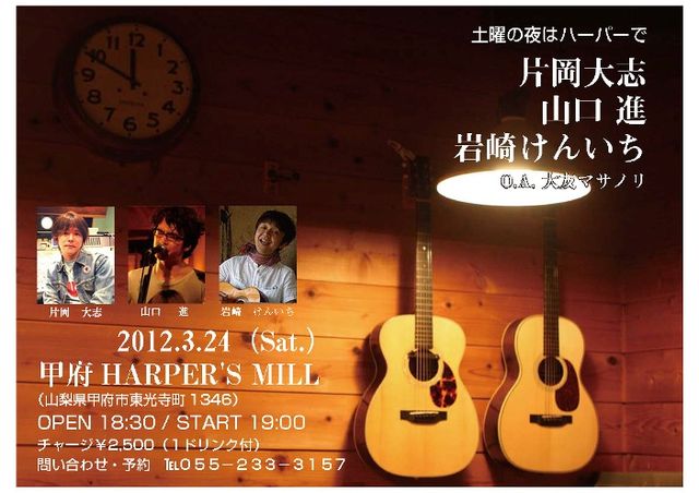 ロックバンドOUTLAWでベース&ヴォーカルとして ほとんどの曲の作詞、作曲を手掛けた山口進さん。 日常生活に基づいた突き刺さるような歌詞、骨太なロックンロールサウンドは、 多くの若者に支持されました。 解散後は、ヴォーカリストとしての可能性に挑戦すべく ギターの弾き語りによるライブ活動をスタート。 現在は、ソロ活動と「夜ハ短シ」というバンドでの活動を並行して行なっています。 そんな彼が、OUTLAW時代のプロデューサーでもあり、 人生の師としても尊敬している片岡大志さんを 「ふるさと山梨」に迎えてライブイベント