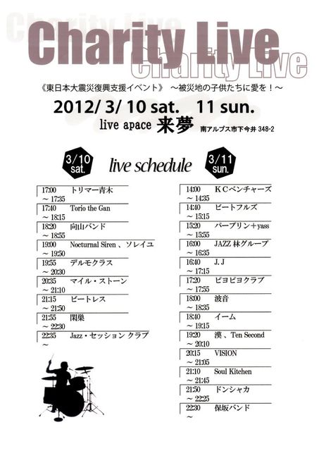 ■ 保坂さんから、チャリティライブ の告知を依頼されたので、ここにトピを立てます ■ (出演バンドの募集は締め切ったとのこと) 3・10(土)、11(日)の二日間に渡ってのチャリティライブ! 入場無料です。 よろしくです! ---------------------------------------------------------------------- タイムテーブル ---------------------------------------------------------------------- ★1日目(3/10:土) 1.トリマー青木 5:00