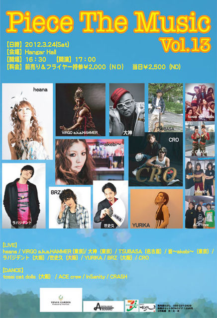 2012年 3月 24日(土曜) 『Piece The Music 〜Vol.3〜』 山梨県田富流通銀座 @ Hangar Hall OPEN 16:30 START 17:00 〜 前売り \2000- (D別) W/F \2000- (D別) 当日 \2000- (D別) 【LIVE】 heana / ViRGO a.k.a.HAMMER (東京) / 大神(東京)/ TSUBASA(名古屋)/ 妛〜akebi〜(東京)/ ラパジデント(大阪)/ 世史久(大阪)/ YURIKA / BRZ(大阪)/ CRO 【DANCE】 tossi cat dolls(大阪) / ACE crew / InSanity / CRASH 【協賛】 VENUS GARDEN / COCKTAIL HOUSE ASUNARO /セブンイレブン長坂インター東店 /馬肉屋