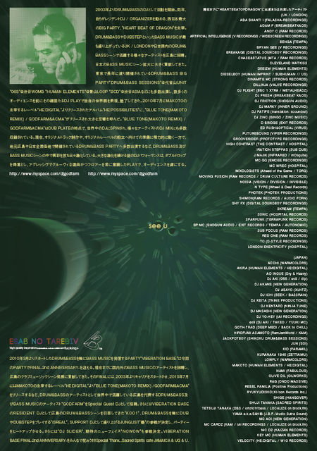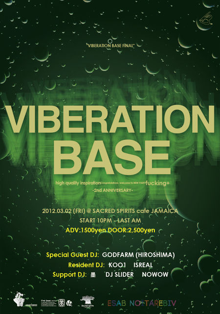 2010年3月よりスタートしたDRUM&BASSを軸にBASS MUSICを発信するPARTY"VIBERATION BASE"は今回のPARTYでFINAL-2nd ANNIVERSARY-を迎える。