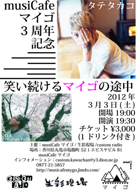 管理人様、失礼します。musiCafeマイゴです。 不適切な場合は削除よろしくお願いいたします。 3/3(土) 「笑い続けるマイゴの途中」 open19:00/start19:30 door\3,000(w/1D) cast タテタカコ O.A. custom radio 今年もタテさんがかけつけてくださいます。 ぜひぜひご参加ください。 お待ちいたしております。 よろしくです。 管理人様、貴重なスペースありがとうございました」。 musiCafeマイゴHP http://musicafemygo.jimdo.com/
