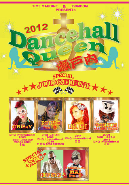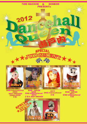 DANCE HALL QUEEN 瀬戸内2012 【日時】 2011/3/3(sat) Start19:30 *通常のイベントより早く始まりますのでご注意ください。 前売り¥2500、当日¥3000 【場所】 @swagg 香川県高松市常盤町 1-5-5 【優勝賞金】 優勝賞金5万円 & トロフィー & 讃岐うどん100人前 & 協賛店商品 【JUDGEMENT】 RUDY-E from努 CRi$sY Lisa Fat BOMBOM オーディエンス 【MC】 CHOPSTICK&MAI from努 【SOUND】 BURNING SHOT MID NIGHT TERMINAL BLACK OPS 【HOST SOUND】 TIMEMACHI